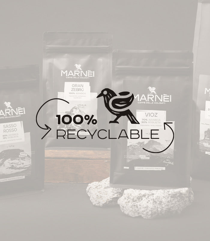 Le nostre confezioni sono 100% riciclabili e dotate di valvola unidirezionale che permette ai chicchi di caffè di essere macinati e confezionati appena tostati, per garantire un caffè sempre fresco.